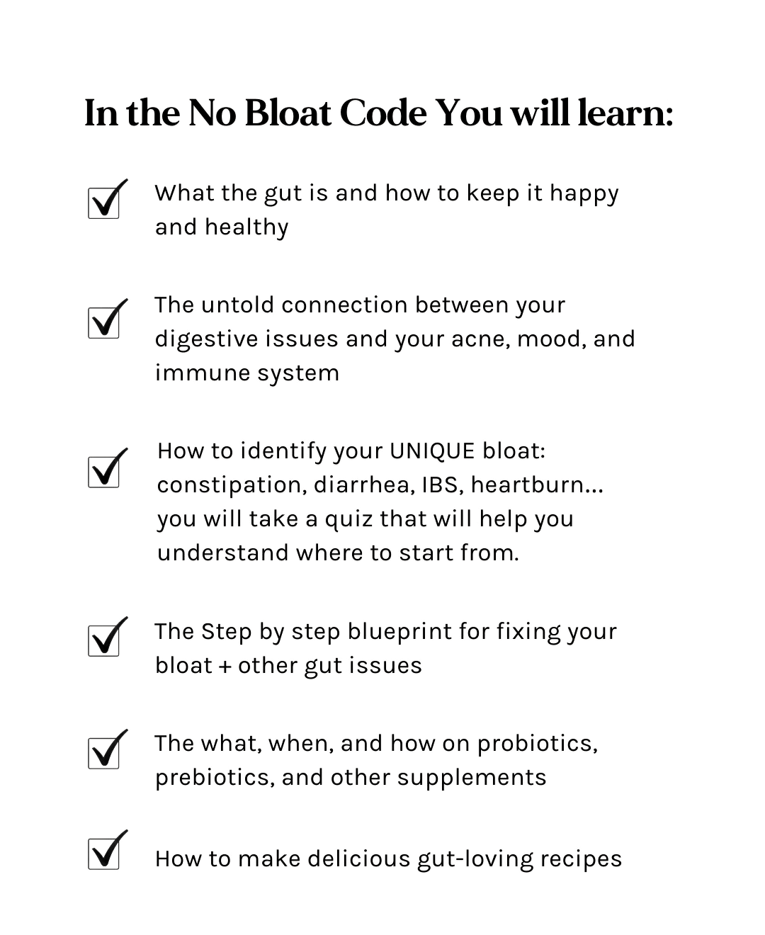 The No Bloat Code is an excellent addition to your healing journey, regardless of what it may look like. All the diet and lifestyle recommendations are designed to adapt to you. Please stay away from foods you know to be allergic to and consult with your doctor regarding new dietary supplements.